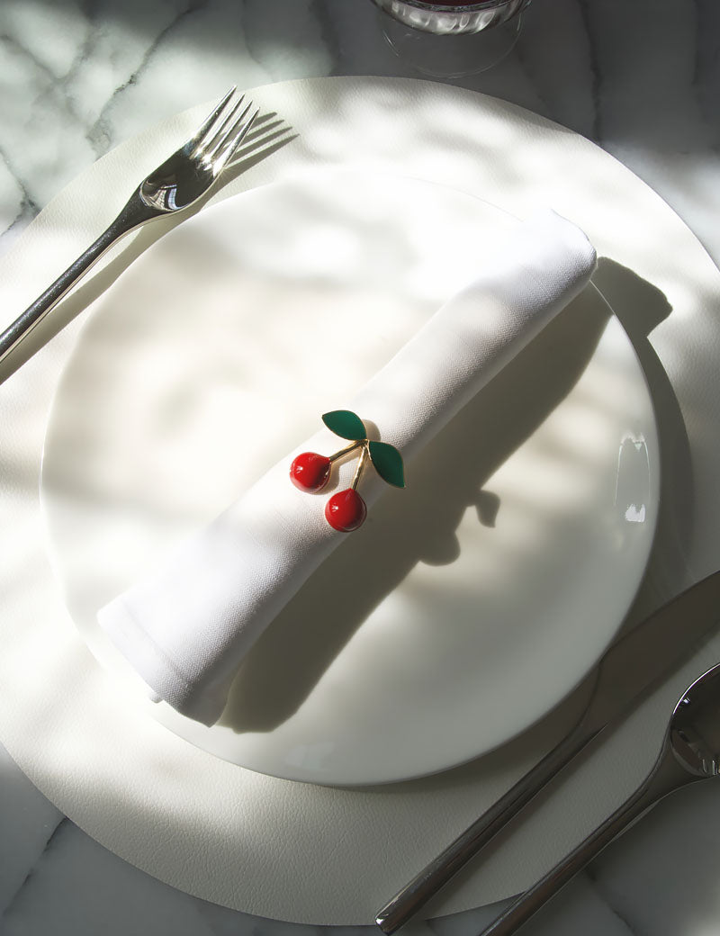 Create a playful and elegant table setting with our gold-colored napkin rings featuring a cherry design. The refined finish and fresh colors add a charming and luxurious touch to your table. Perfect for summer dinners, festive occasions, or a stylishly set brunch.