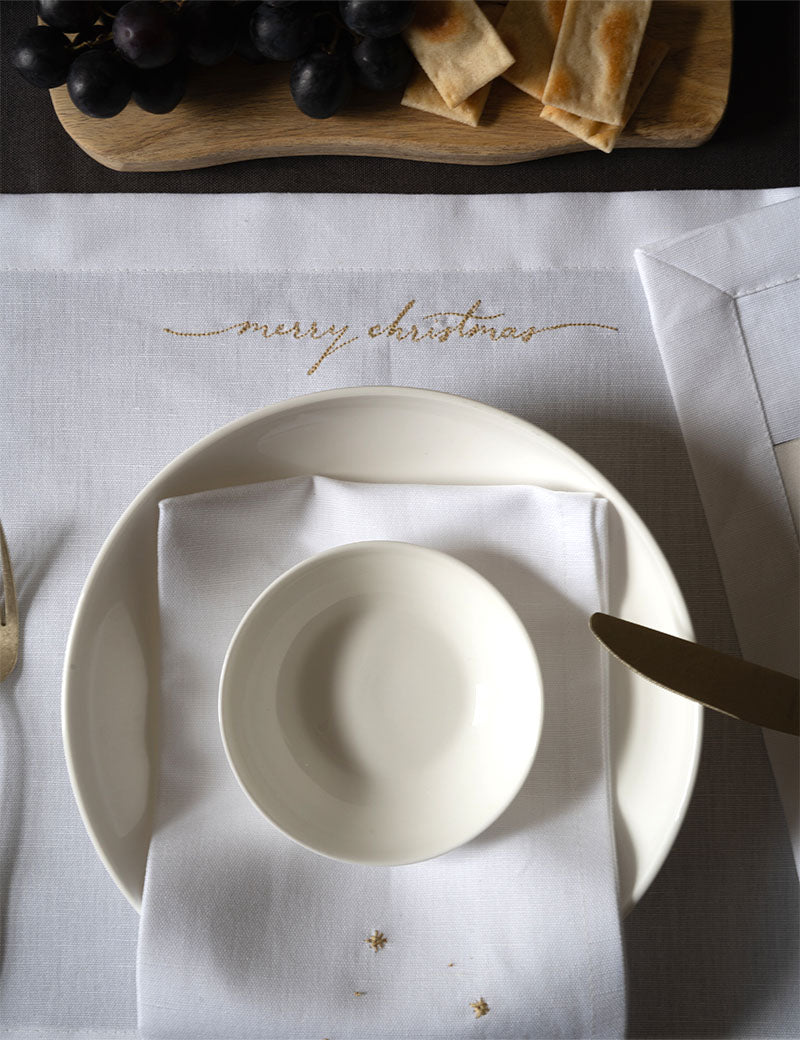 Geef je kersttafel een stijlvolle en feestelijke uitstraling met deze luxe horeca linnen placemats in wit. Verkrijgbaar met een fijn geborduurde Merry Christmas tekst in zilver of goud. Het subtiel glanzende borduursel voegt een chique detail toe, perfect voor een sfeervol diner of feestelijk ontbijt.